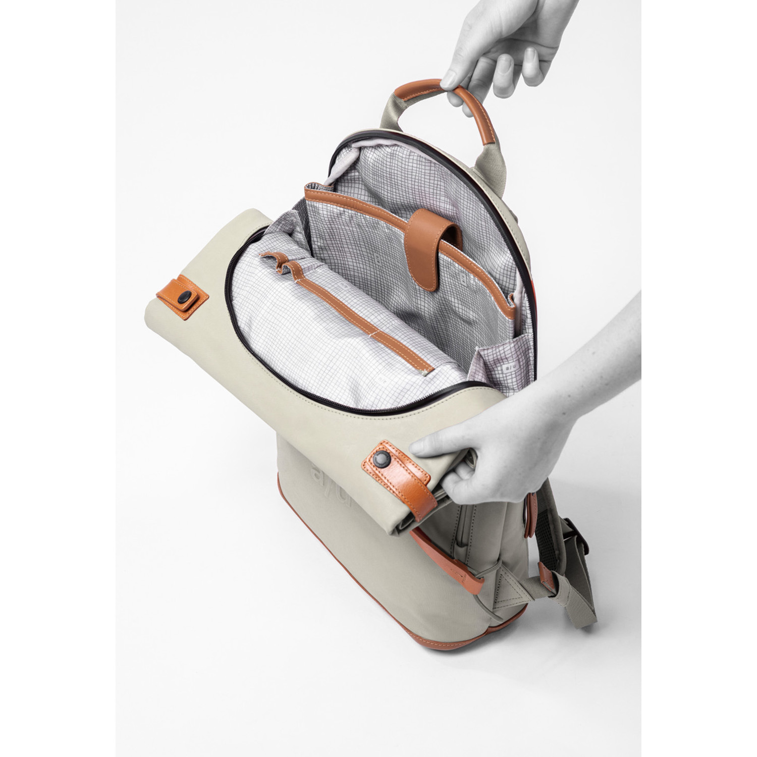 Das Hauptfach schließt mit dem Rollverschluss und Druckknöpfen und beinhaltet ein gepolstertes Tabletfach, ein großes Reißverschlussfach, ein Steckfach, ein Handyfach und zwei Schlaufen für Stifte. Der lederne Boden ist verstärkt. Außen hat der Osaka ein großes, wasserdichtes Reißverschlussfach an der Oberseite, sowie je ein wasserdichtes Reißverschlussfach auf der Vorder- und auf der Rückseite.