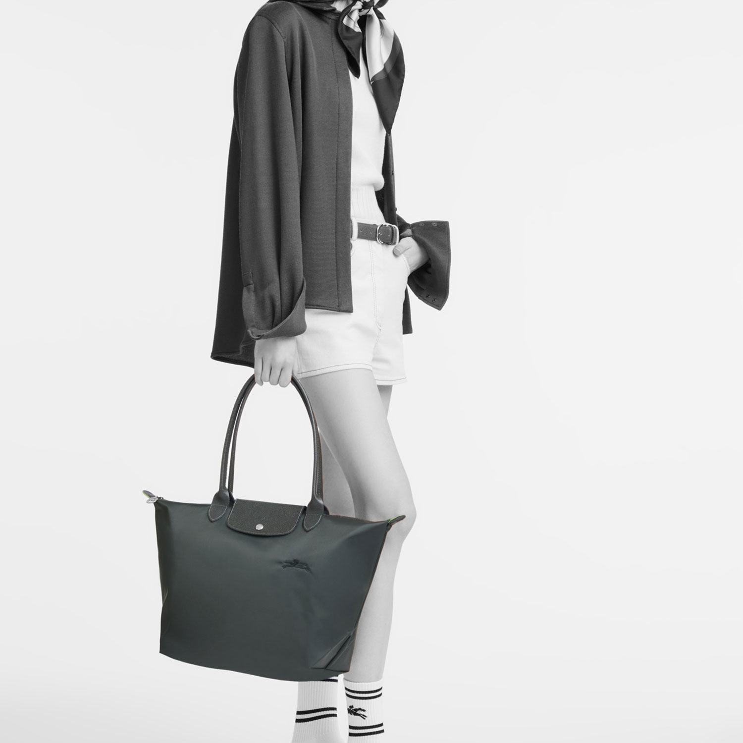 Wie alle Modelle aus dieser Serie läßt sich auch dieses auf eine minimale Größe zusammenfalten. Die Inspiration zu der speziellen Falttechnik ist auf die japanische Origami-Kunst zurückzuführen und machte die LE PLIAGE von Longchamp zu einem weltweiten Klassiker.